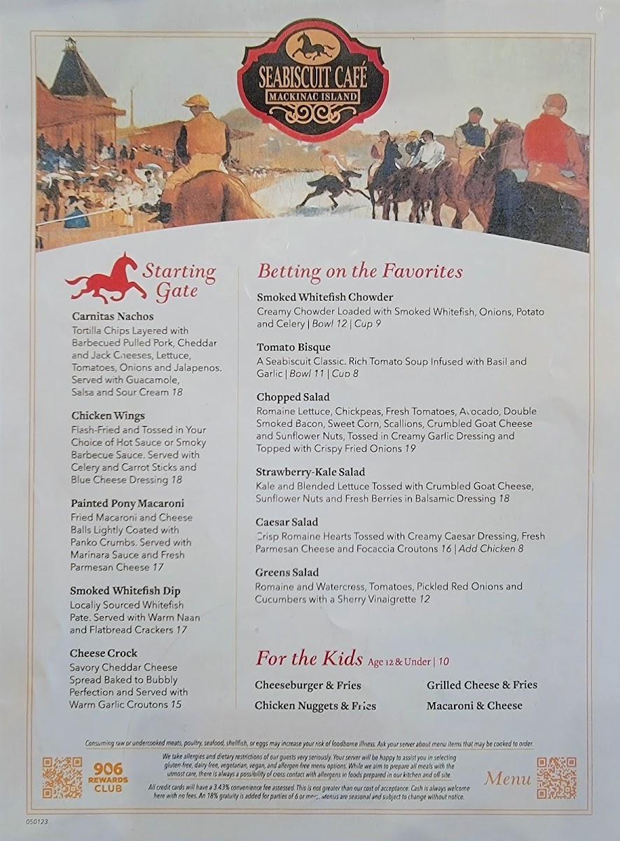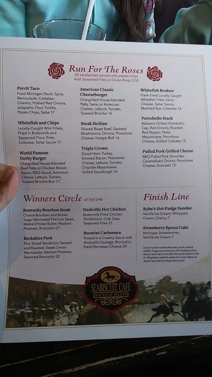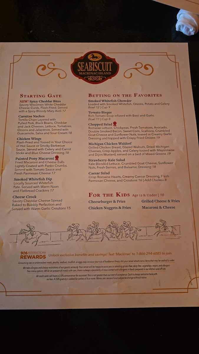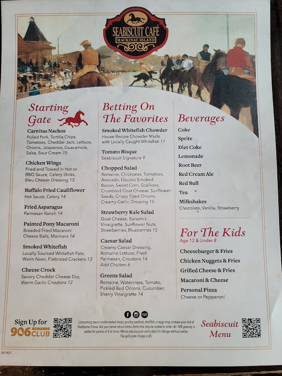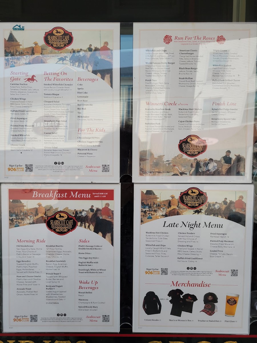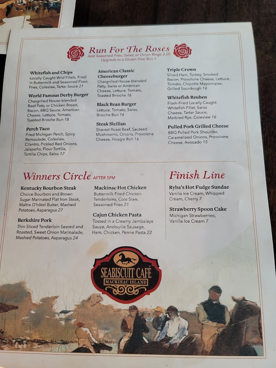Welcome to Seabiscuit, a cozy gem located at 7337 Main St, Mackinac Island. This charming eatery offers a thoughtfully crafted menu that showcases the best of local flavors. You can indulge in dishes like the Run for the Roses—a delightful turkey croissant layered with brie and fig jam, or the savory Whitefish Reuben featuring flash-fried local whitefish on grilled marble rye.